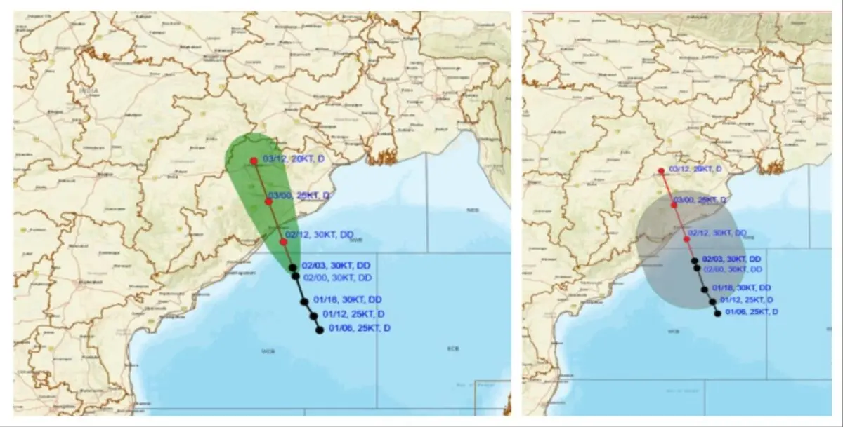 The system was about 90 km south-southeast of Gopalpur, 140 km east-northeast of Kalingapatnam (Andhra Pradesh), 140 km south-southwest of Puri (Odisha), 230 km east-northeast of Visakhapatnam (Andhra Pradesh) and 240 km southwest of Paradip (Odisha) at 11.30 am.