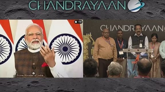 “Humne dharti par sankalp kiya aur chand pe usse sakaar kiya (we made a resolution on Earth and achieved it on the Moon)… India is now on the Moon,” said Modi.