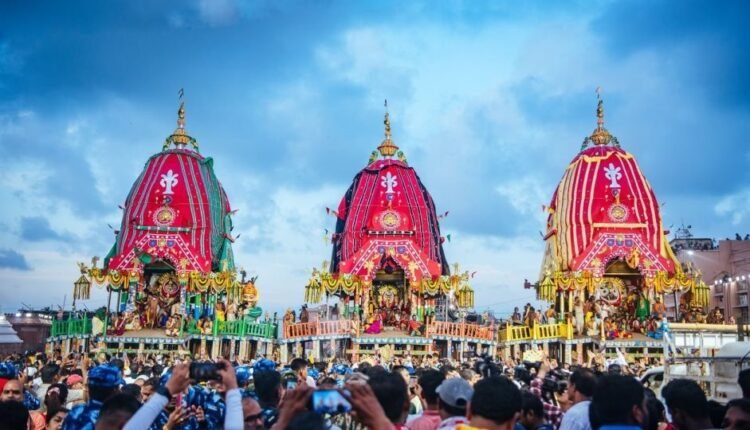 Puri: Lakhs of devotees thronged Odisha’s pilgrim town of Puri on Wednesday to witness ‘Suna Besha’ as Lord Jagannath, Lord Balabhadra and Devi Subhadra adorned in elaborate gold ornaments on their respective chariots parked at Simhadwar.