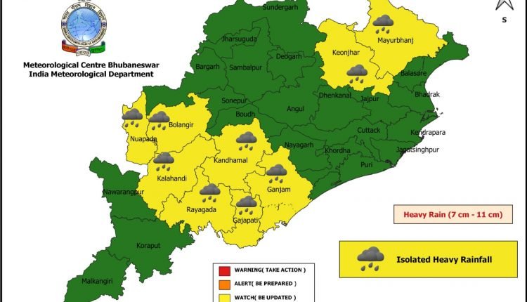The weather agency issued yellow warning of heavy rain (7 to 11cm) at one or two places of Balangir, Kalahandi, Rayagada, Gajapati, Ganjam, Kandhamal, Nuapada, Mayurbhanj, and Keonjhar during the next 24 hours.