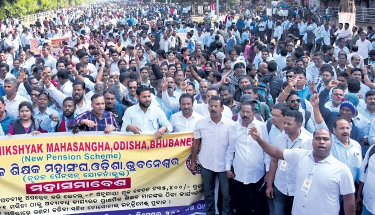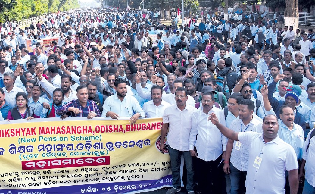 The teachers under the banner of Prathamika Shikshyak Mahasangha demanded upgradation of teacher posts to level-2 and provision of salary at Rs 35,400 with Rs 4,200 grade pay, and grant of regular service benefits along with notional increments to all teachers of NPS category who have been serving since 2001.