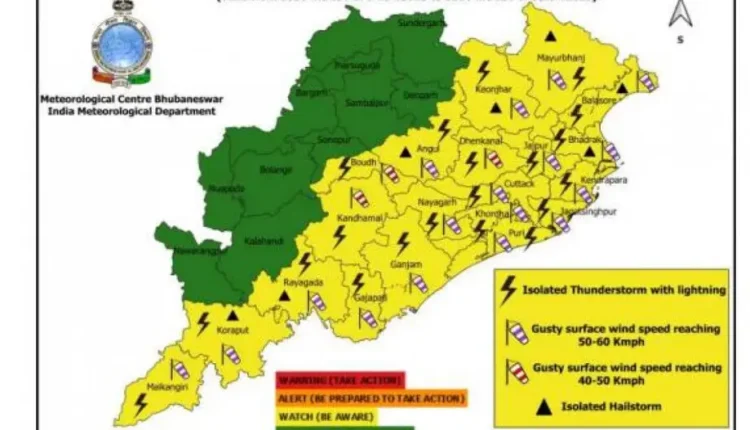 Yellow Warning: Thunderstorm with lightning with gusty surface wind speed reaching 30-40 kmph likely to occur at one or two places over the districts of Koraput, Malkangiri, Nabarangapur, Rayagada, Kalahandi, Nuapada, Bolangir, Kandhamal, Boudh, Angul.