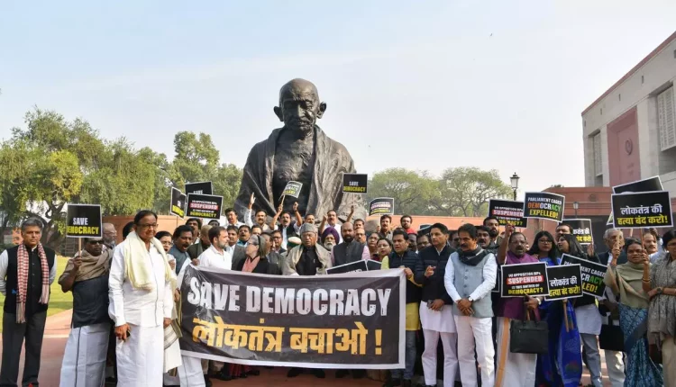 New Delhi: Opposition MPs suspended from the Lok Sabha and Rajya Sabha, led by Congress chief Mallikarjun Kharge took out a protest march on Thursday morning from the old Parliament building to Vijay Chowk in central Delhi. They were carrying a large banner that read “Save Democracy”, and placards reading “Opposition MPs Suspended! Is This The End of Democracy?” and “Parliament Caged, Democracy Expelled!”
