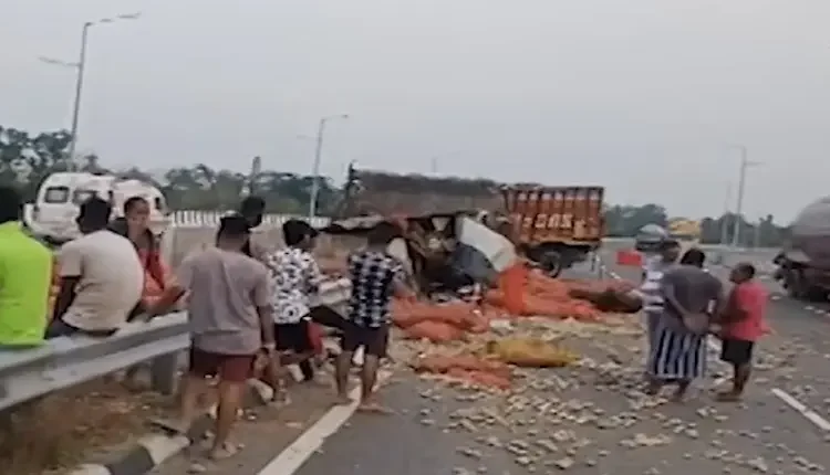 According to sources, the accident occurred around 4.20 am when a truck transporting potatoes from Kolkata in West Bengal to Bhubaneswar dashed against another truck, which was attempting to overtake, and struck the divider after the impact, causing it to overturn. The driver and helper were thrown off the truck along with the potato sacks and were trapped underneath them.