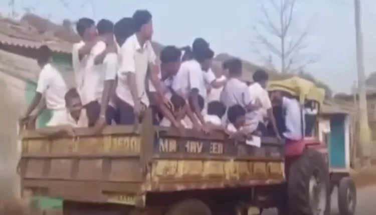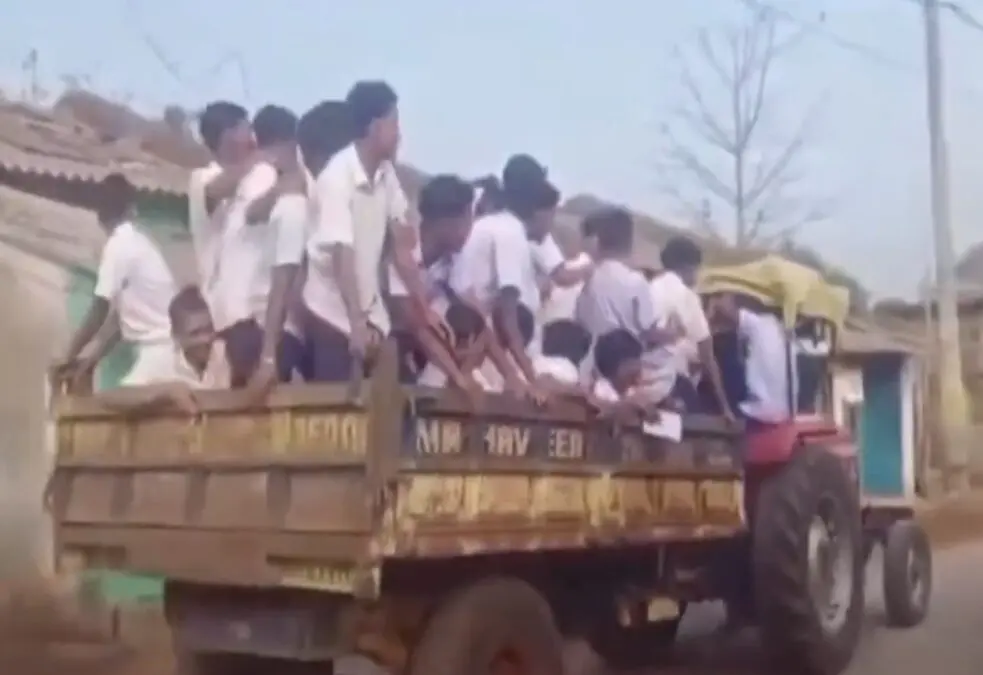 The footage shows more than 30 Class 10 (matriculation) candidates from PM Shri High School in the K Nuagaon area clinging to a tractor as it transported them along bumpy rural roads to their designated examination centre at Kudutuli High School, roughly 3 km away.